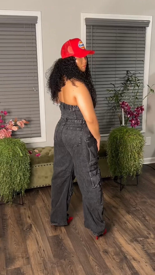 Sold outDenim Strapless Cargo Jumpsuit