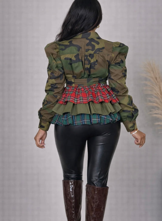 Camouflage and Plaid Peplum Blouse
